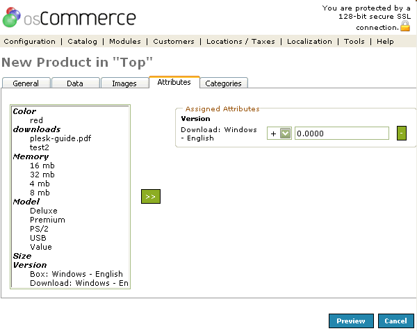 The first screen of the "New Product or Editing Products" area is the General screen showing the Products Name, Products Description, and Products URL in the body and the "New Product" links, Data, Images, Attributes, and Categories across the top.
